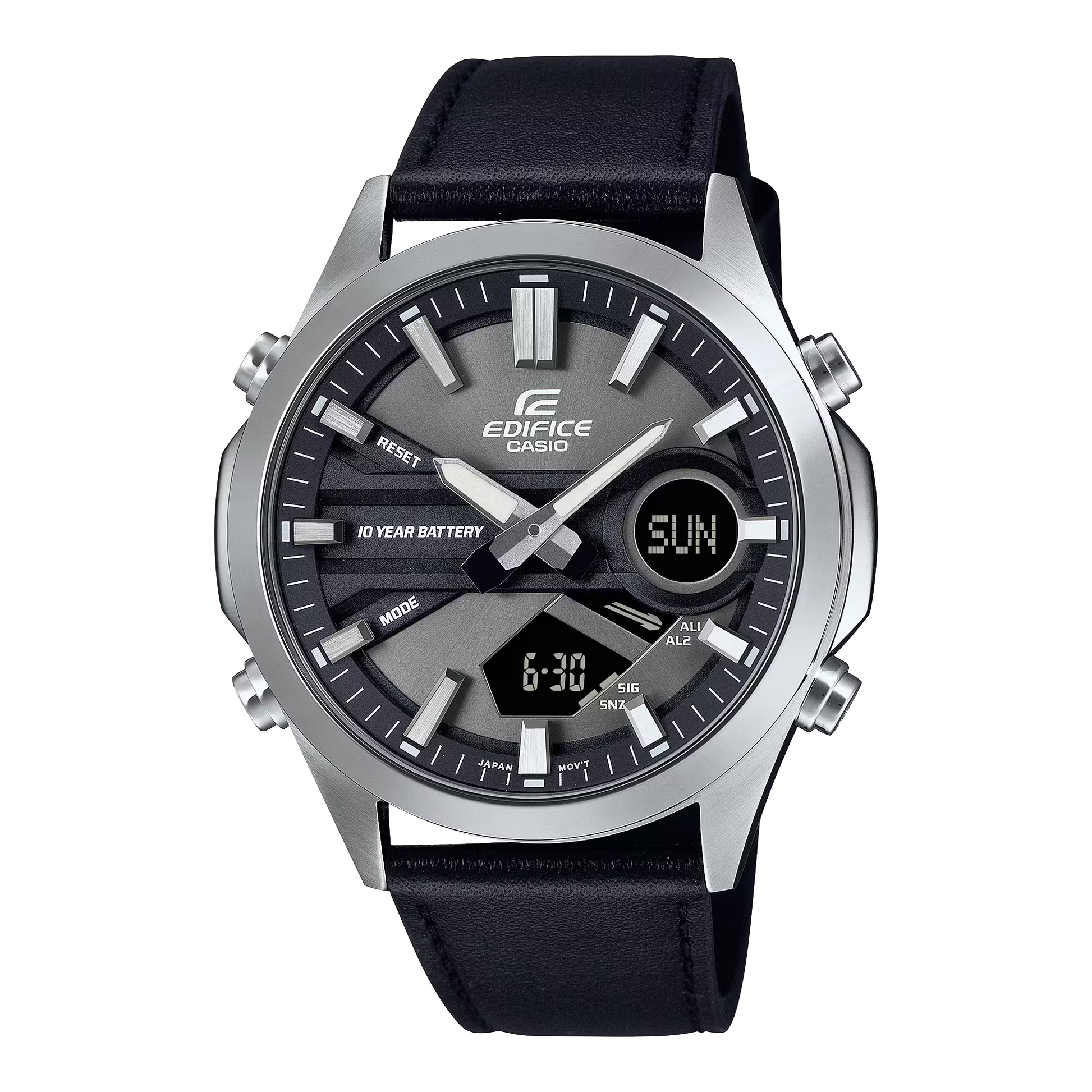 Son boîtier acier et son cadran noir épuré offre un design contemporain et compact, tandis que sa batterie 10 ans vous libère des contraintes d'entretien fréquent. Dotée de fonctionnalités avancées—heure mondiale, chronomètre, alarme, compte à rebours—et d'une résistance à l'eau jusqu'à 10 bar, cette montre s'adapte à tous vos défis quotidiens. L'évolution réussie du modèle EFV-C110, combinant autonomie exceptionnelle et sophistication intemporelle avec son bracelet cuir noir élégant.